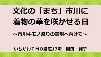 大好きな着物を通し、そこで見た光景、人々、歴史ある文化の街市川で私が感じた事や見つけたもの、実現したい事を発表させていただきます。