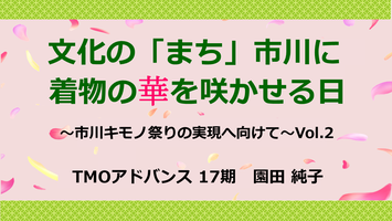 そのご紹介とTMOアドバンス講座発表後に進展した内容と市川キモノまつりの実現へ向けてのはじめの一歩になる和装de行徳・南行徳神社めぐりの進捗をお伝えします。